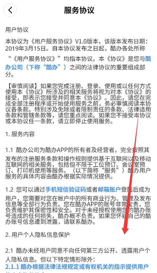 2、仔细阅读服务协议内容,向下滑动浏览全部条款细则。