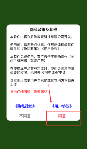 1、首次启动应用程序需阅读并确认相关服务条款,点击同意按钮后即可进入主界面开启学习之旅。