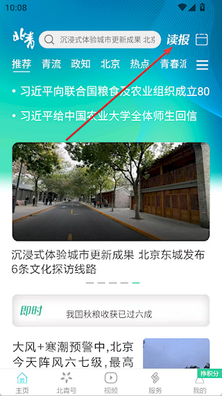 1、打开北京青年报客户端,在主页点击右上角【读报】