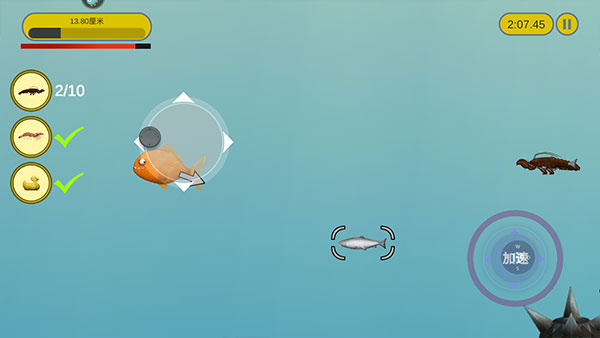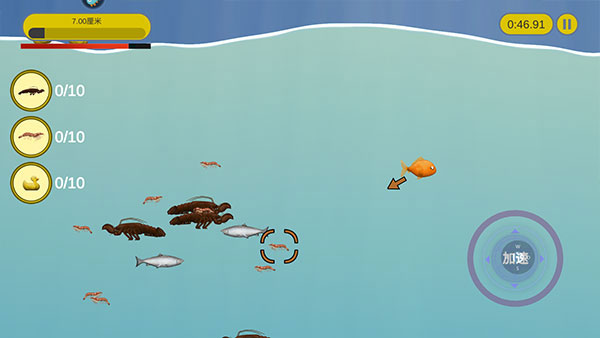 3、捕捉海洋生物是核心技能,可在海中自由游泳,捕获任何体型小于自身的鱼类作为食物。