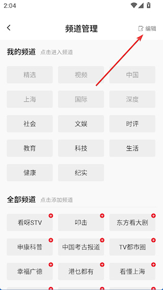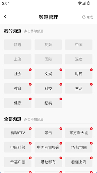 3、长按可以拖动排序,点击频道右上角黑色图标添加或删除