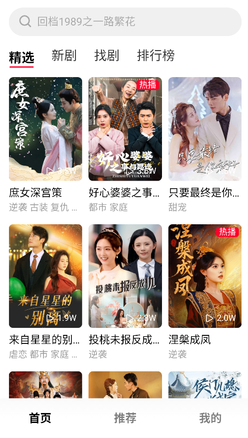 内容推荐区:展示热门剧集、新上内容,如《回档1989之一路繁花》、《麻女深宫策》等。