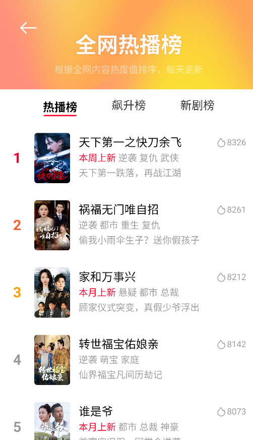 榜单分类:包括“热播榜”、“飙升榜”、“新剧榜”,每日更新。