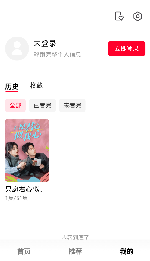 观看记录:支持查看“全部”、“已看完”、“未看完”的观看历史。
