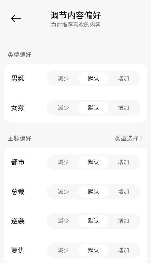 类型偏好:调节“男频”或“女频”内容的推荐强度。