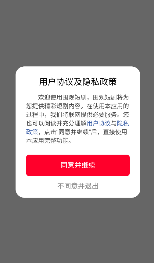 首次使用时,系统会显示 《用户协议及隐私政策》 页面