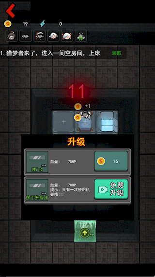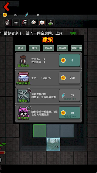 3、防御搭建:用金币升级房门增强耐久,建造炮台攻击猛鬼,还可解锁 “闪电塔”“激光阵” 等高级设施。