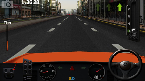 4、左下角的第一个踏板是【刹车】,如果我们按住此踏板不松,就可以降低自己的车速,来与前车保持安全距离。
