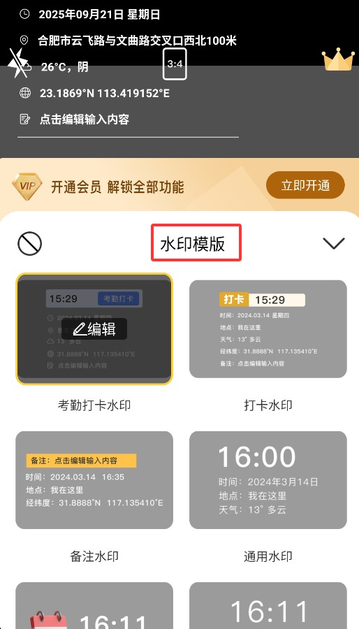3、旅行足迹打卡:开启足迹打卡模板,拍摄景点照片,水印显示温度27℃+晴+北京东经116.4°,分享生成旅行轨迹图。