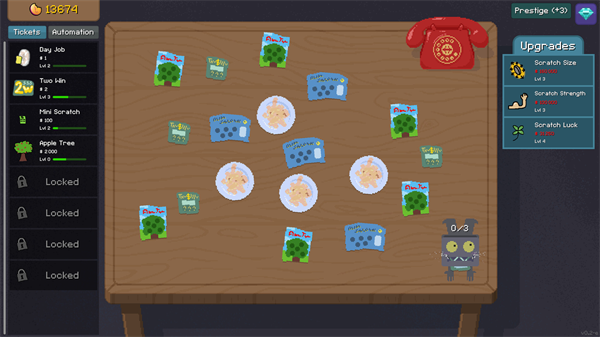 2、从手动刮$1卡片到自动刮$10000 卡片,从 无被动收益到 双被动收益(自动刮卡 + Apple Tree)”,通过不断地升级提高收益。高阶大奖(Jackpot)与声望系统(Prestige)为后期提供明确目标,避免玩法单调。