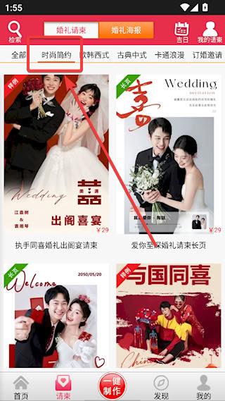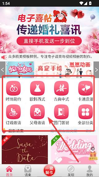 1、下载安装后点击进入婚礼请柬APP,首页提供了丰富的请柬风格