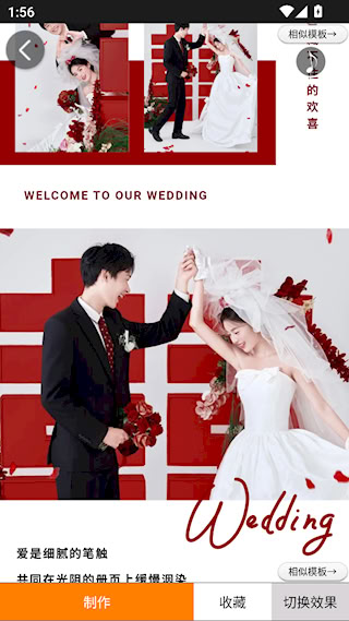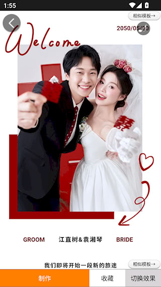 4、支持创建动态婚礼视频相册,可将珍贵影像素材串联成篇。提供多种转场特效与滤镜选项,搭配背景音乐生成感人短片。视频既可用于请柬内嵌预览,亦适合婚礼现场循环播放。