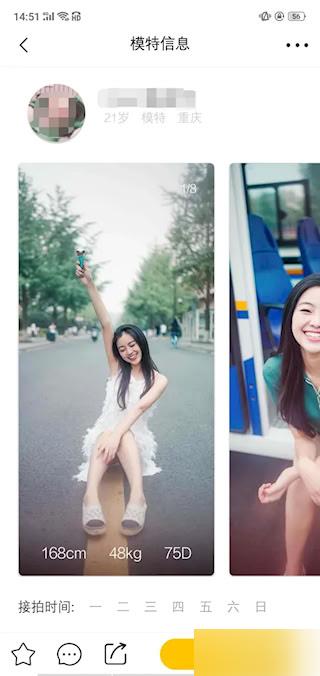6、 模特资料页信息完整,除展示照片外,明确列出身高、体重、可接拍时间段及常驻城市等关键信息。为摄影师评估合作匹配度提供了充分的决策依据。