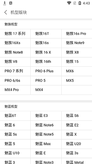 3、回到主界面,点选机型栏目,展示魅族全部设备型号;