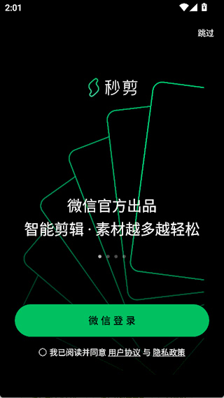 1、下载安装秒剪app后启动,在登录界面可以点击右上角跳过