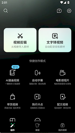 5、文字录音创作:无需视频素材,输入文字或录制音频后,系统自动生成带讲述效果的视频,提供专属创作路径。