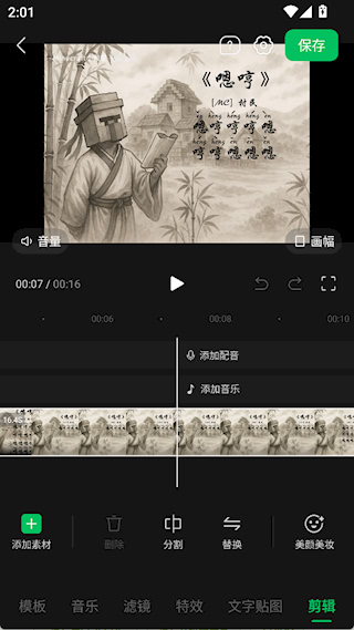 3、视频剪辑界面有模板、音乐、滤镜等工具可以使用,配合时间轴对视频进行精细处理