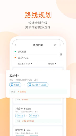 1、 输入目的地后,系统将自动生成包含公交与地铁的多种出行方案,并告知车辆实时位置、发车时刻与换乘提示,信息更新及时且精准。