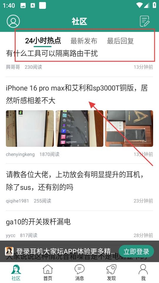 3、切换至社区板块,可浏览热门话题与新发布内容,选择感兴趣的帖子如设备听感分析,点击进入即可阅读并参与交流。