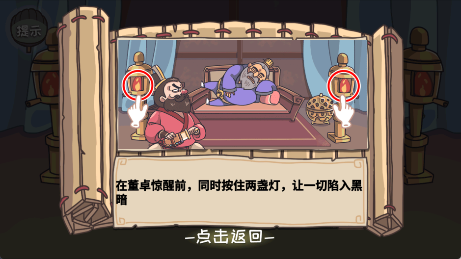 4、根据提示的说明,需要在董卓惊醒前同时按住左右两盏灯
