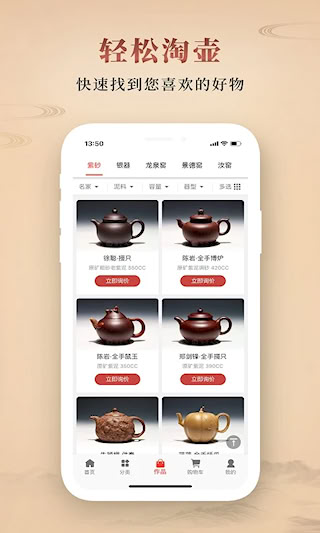 淘壶人是一个专注于紫砂器具的鉴赏、交易与文化交流的手机应用。核心功能涵盖作品鉴证、在线竞拍、私人洽购三大板块。每件作品均配备详细作者档案与制作工艺说明,部分重要作品提供权威鉴定证书。通过高清微距拍摄与360度全景展示,完整呈现泥料质感与手工痕迹,有效降低线上鉴赏的信息偏差。