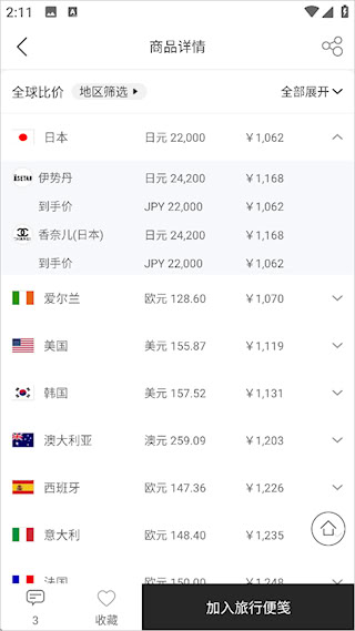 5、进入商品详情页后向下滑动页面,即可浏览该商品在全球不同地区的实时售价对比列表。