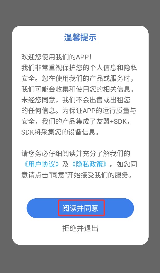 1、首次启动应用时,请点击弹窗中的同意选项,方可进入主界面开始使用。
