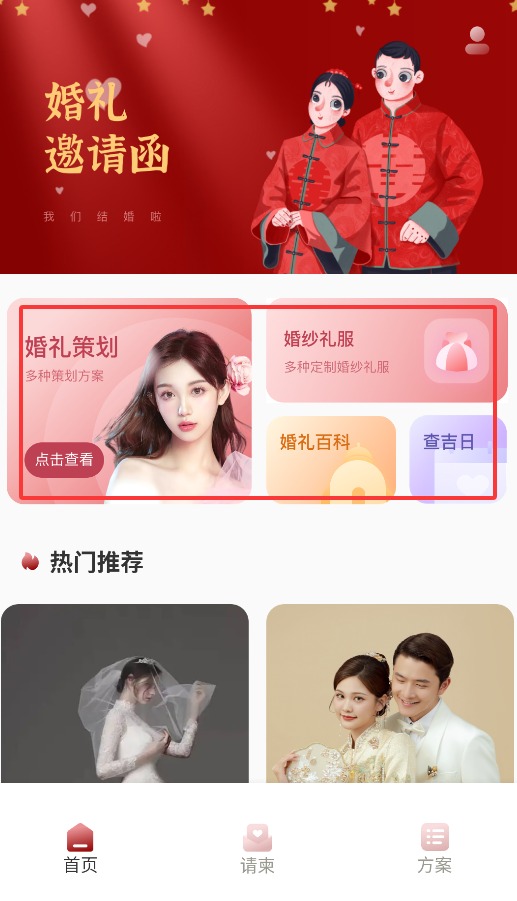 2、在首页功能区,可使用婚礼策划、婚纱推荐、百科知识及吉日查询等服务。