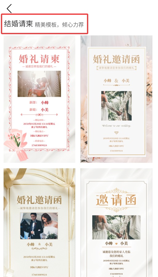 3、通过请柬模板板块,可浏览并选择精美的结婚请柬设计模板。