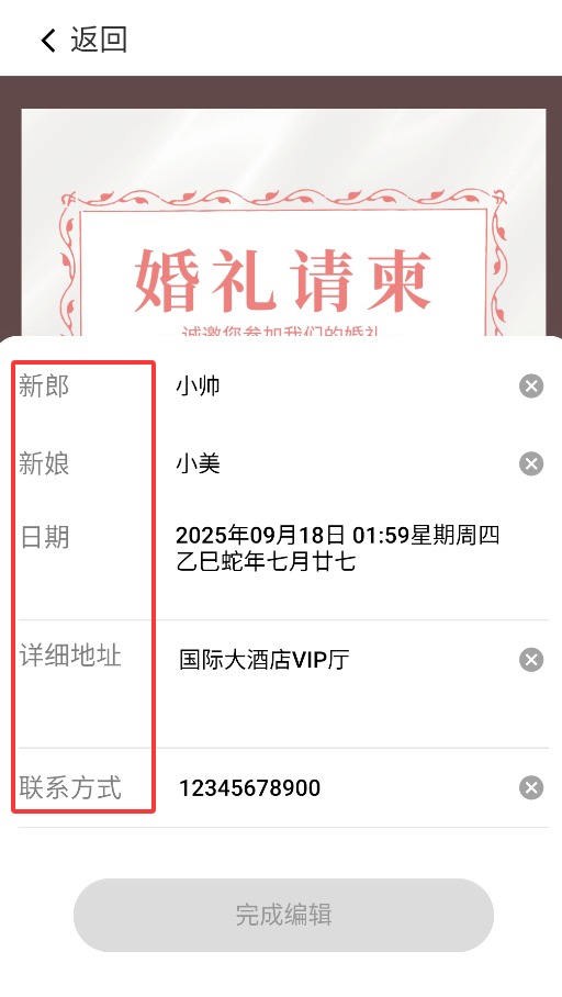 4、进入编辑页面后,可自定义修改新郎新娘姓名、日期、地址及联系方式等内容。