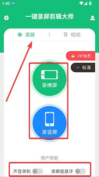 1、打开一键录屏剪辑大师APP,可以选择录屏方向,下方还能选择是否录制声音和开启悬浮窗