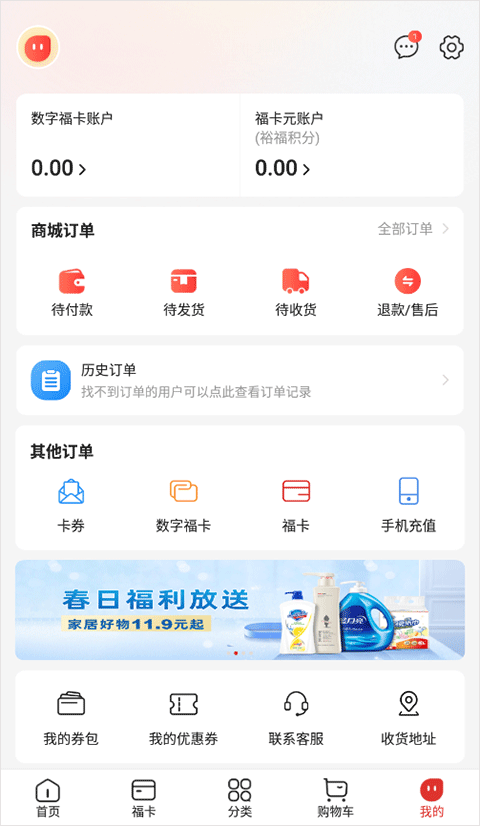 1、打开裕福商城 APP,进入 “我的” 功能板块,点击 “副卡账户” 选项。