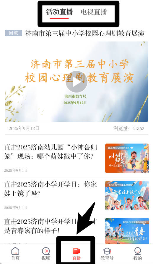4、在直播页面,可选择活动直播或电视直播,实时获取教育活动最新动态。