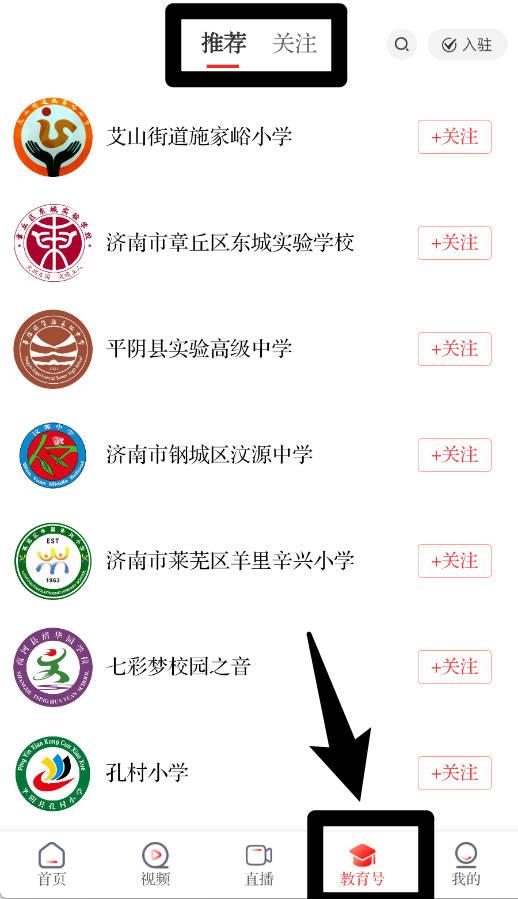 5、进入教育号版块,可以关注学校教育号,查看推荐或已关注的学校信息。