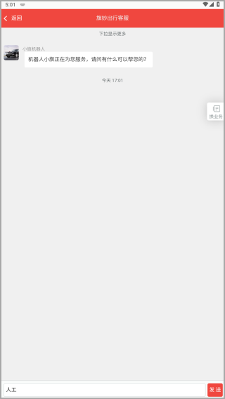5、在界面下方的输入框中输入 “人工” 并发送,即可联系到人工客服。