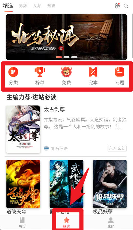 4、切换到精选栏目,可以浏览分类、榜单、免费、完本和专题等多种阅读资源。
