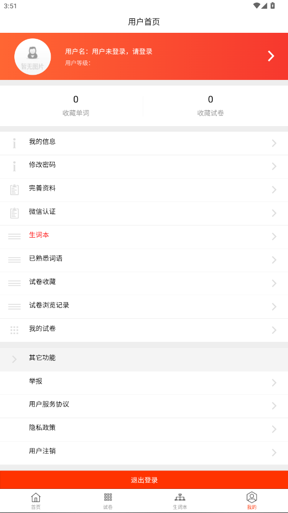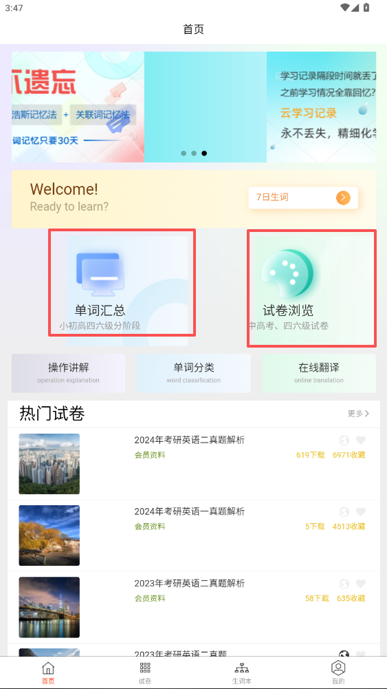 2、进入软件首页,有单词汇总(小初中高中四六级阶段)、试卷浏览(中高考、四六级试卷)、各种操作讲解、单词分类等