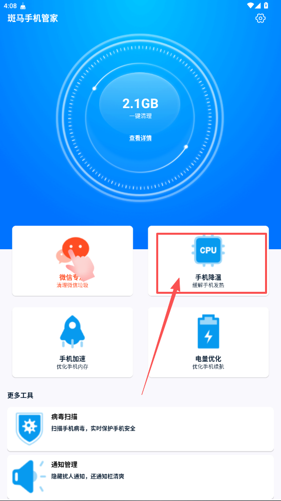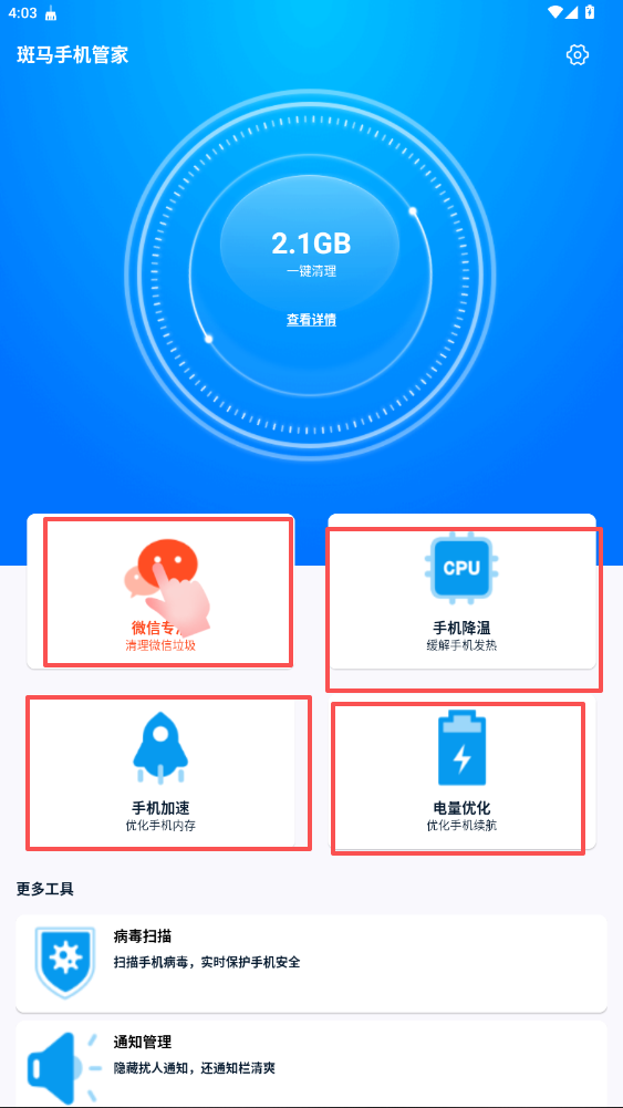 4、能够进行微信清理、手机降温、手机加速、电量优化等