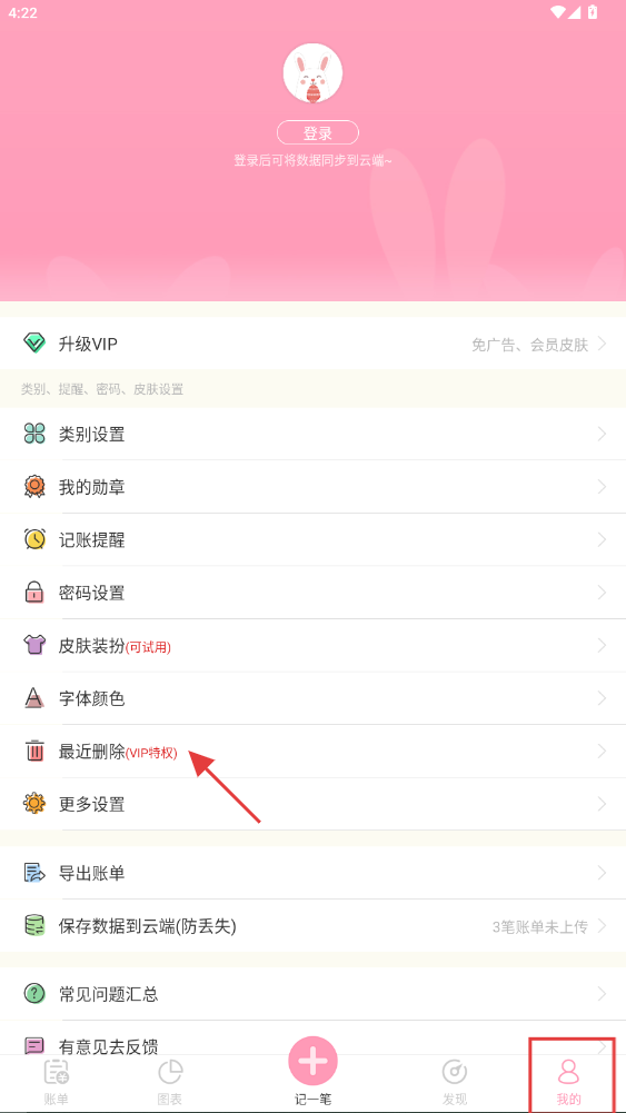 4、删除后的账单会自动存储到App内的最近删除功能模块中,若需将账单完全移除,可在App底部菜单栏找到点击【我的】选项并点击最近删除即可。
