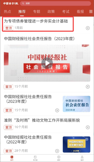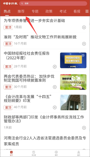 2、在主页面选择推荐栏目入口,浏览各类专业会计资讯的分类列表。