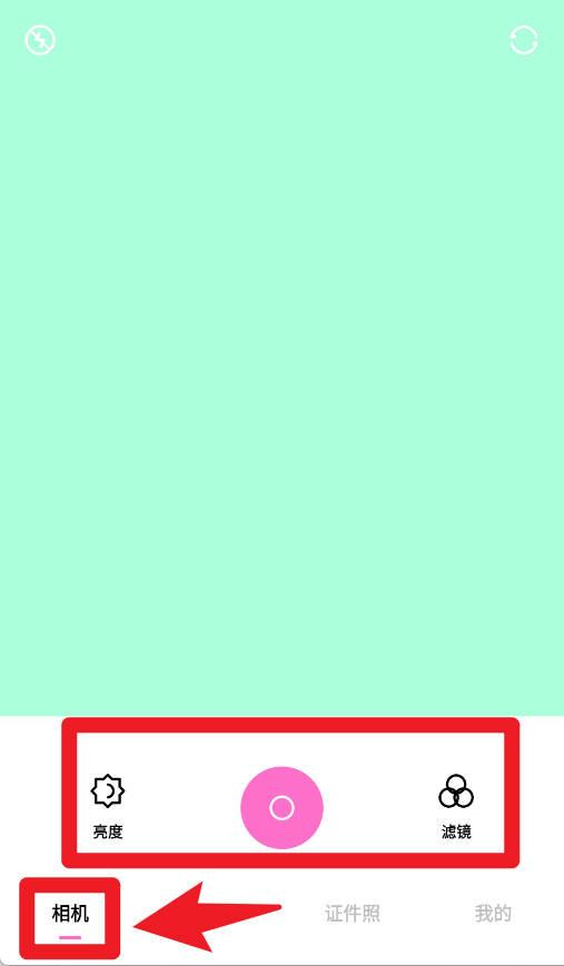 1、相机页面支持亮度调节与滤镜选择,点击中间按钮即可快速拍摄照片。