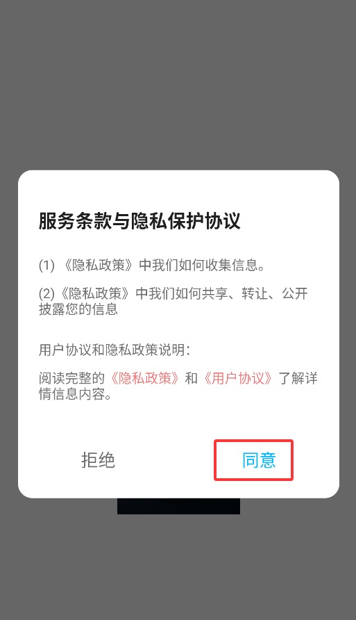 1、首次启动应用时,请点击弹窗中的同意选项,方可进入主界面开始使用。