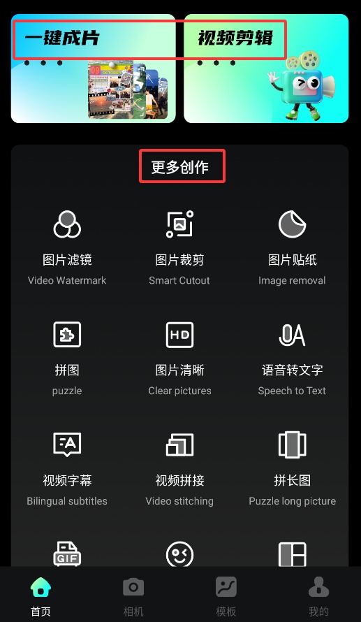 2、在首页功能区,可使用一键成片、视频剪辑及图片滤镜、裁剪、贴纸等创作工具。