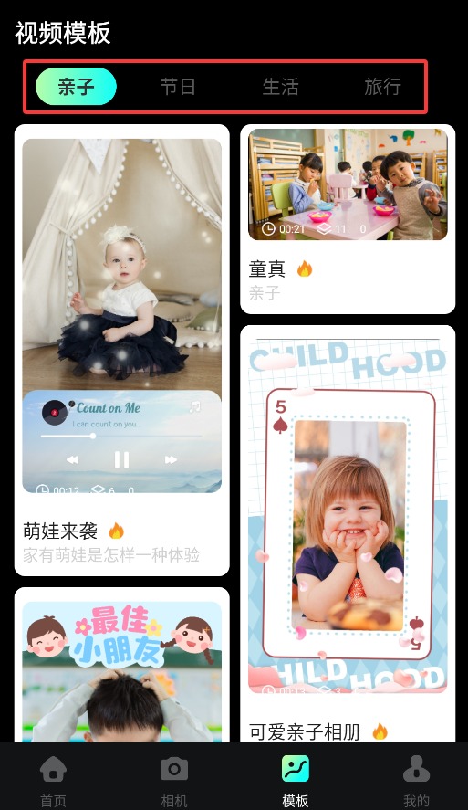 4、进入模板中心后,可选用亲子、节日、生活、旅行等主题模板快速生成作品。