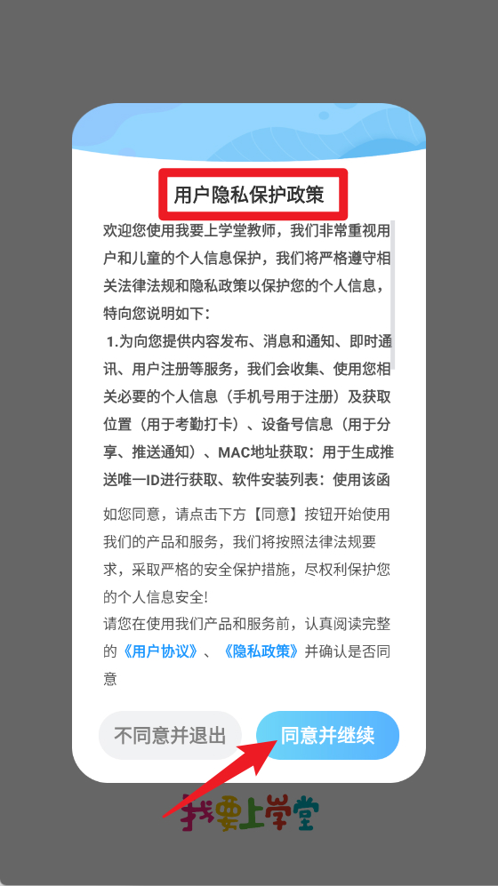 1、首次打开应用,请认真阅读相关条款,点击同意并继续完成确认后进入应用。