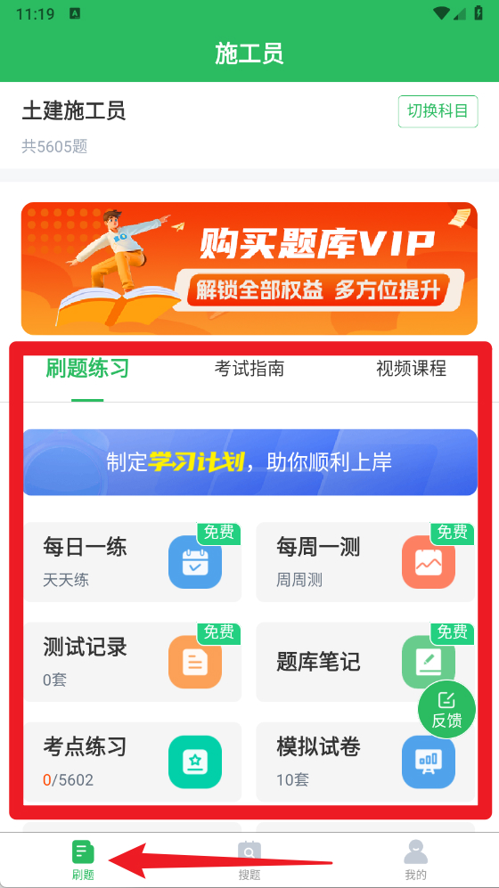2、 题库类型:设置每日打卡、章节练习、历年真题等模块;支持分阶段系统性学习。