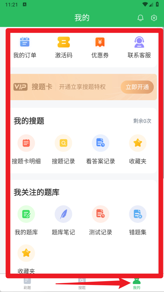 5、在我的页面,可查看订单、激活码、优惠券和联系客服,同时还能管理搜题记录、错题集、题库笔记及收藏夹,实现个性化学习。