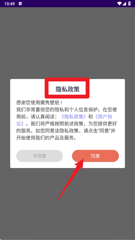 1、首次打开魔秀壁纸应用,会弹出隐私政策提示,请认真阅读后点击下方同意,确认接受后才能进入主页面使用壁纸功能。