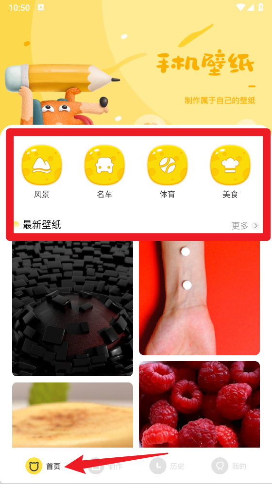 2、在首页板块,可以浏览最新壁纸,按分类查看风景、名车、体育、美食等主题,直接点击即可进入壁纸详情。