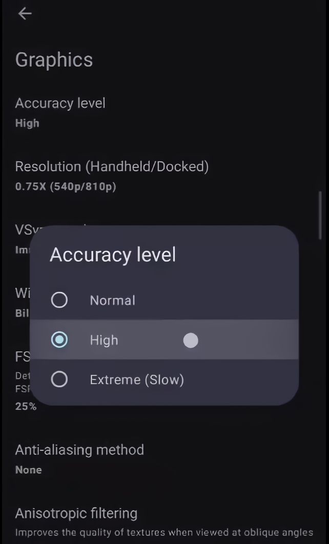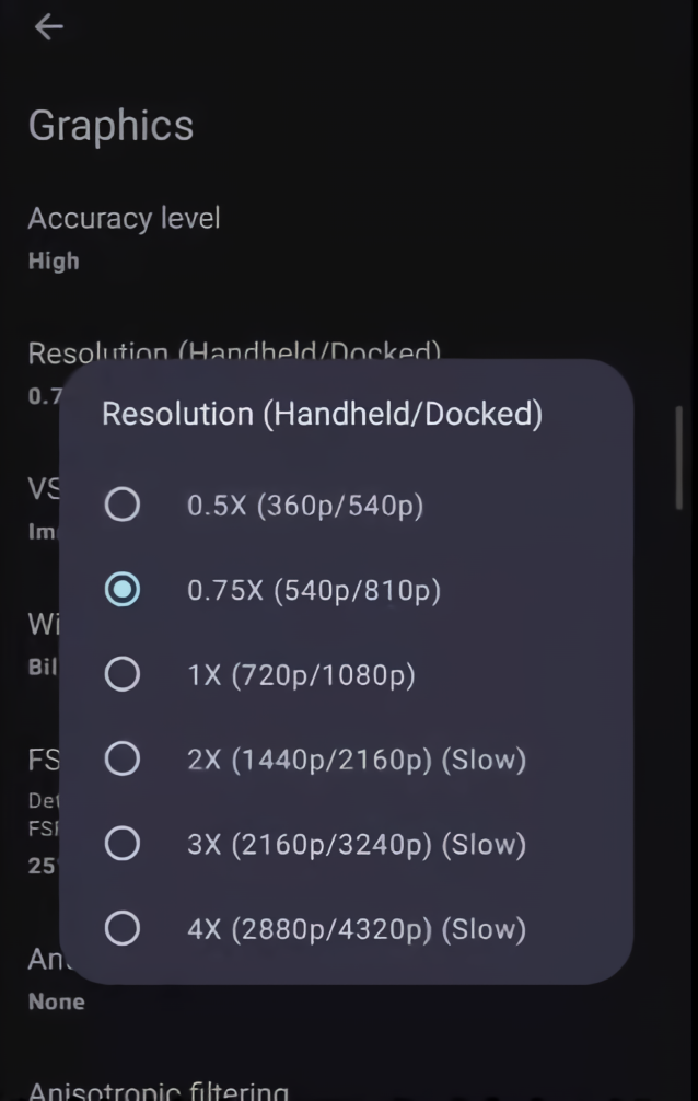 3、分辨率建议始终设为较低的 0.75 倍以提升性能;若使用低端手机,选择 0.5 倍分辨率效果更佳。